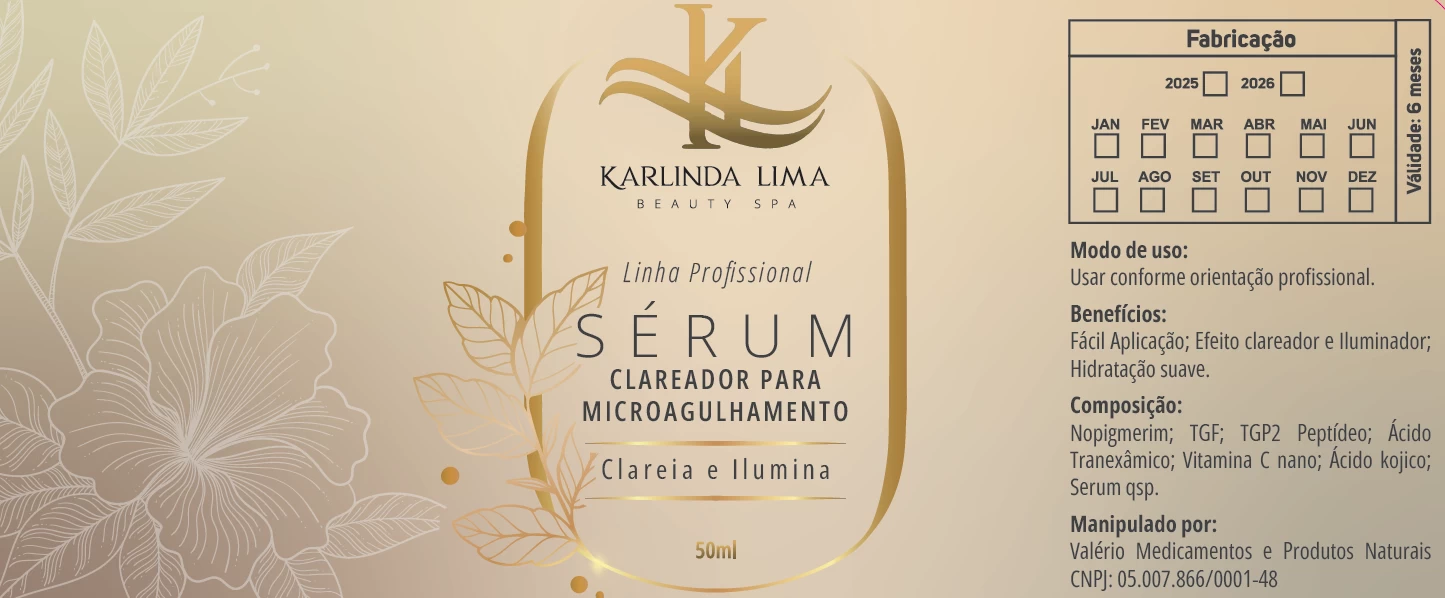 Rótulo para Karlinda Lima – Sérum Clareador em BOPP Metalizado e medidas 115x49mm (base x altura).